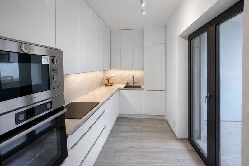Byt je vybaven kuchyňskou linkou na míru včetně vestavěných spotřebičů