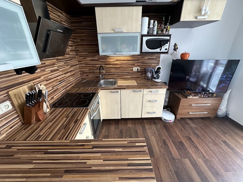 Byt je vybaven kuchyňskou linkou na míru včetně vestavěných spotřebičů.